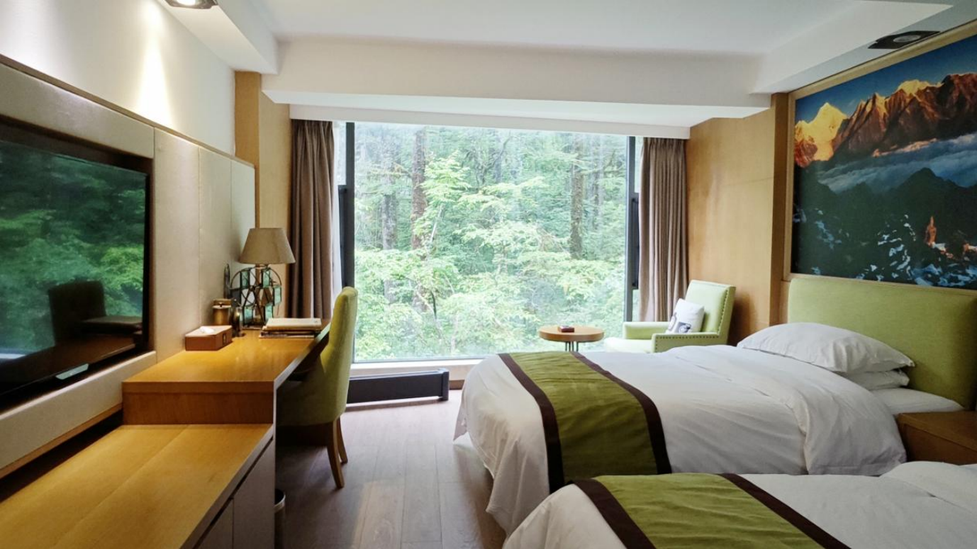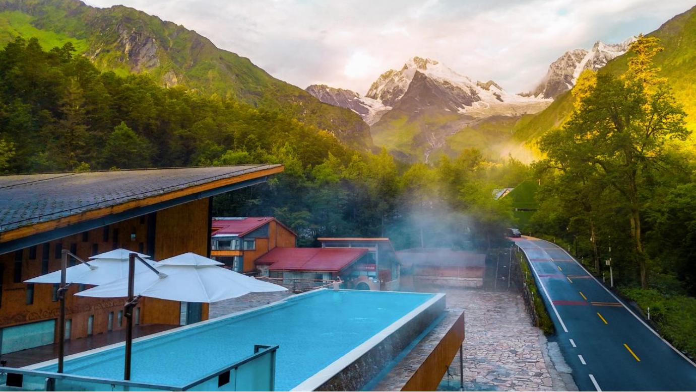 清晨,当第一缕阳光洒在雪山上,您站在酒店观景平台,就能目睹震撼的日照金山!被雪山森林环抱的天然温泉,像块浸在绿里的玉,晴日映着金山倒影,雾天裹着云峦似仙境;夏天林海涌进池边,揉碎满山晴光,冬日泡汤看雪落,体验人间极致“冰火两重天”。